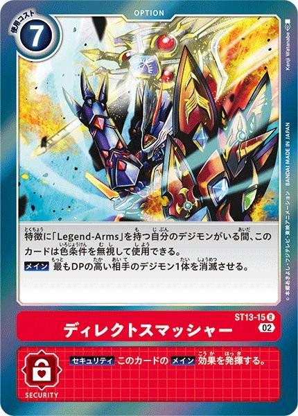 防具型/LegendArms DP 4000 登場コスト 5 進化コスト1 Lv3から2 進化コスト2 赤 効果 登場時このデジモンを特徴に「LegendArms」を持つか赤の他の自分のデジモン1体の進化元の下に置くことで、次の相手のターン終了まで、自分のデジモン1体は≪再起動≫(相手のアクティブフェイズに、こ Las LegendArms (「LegendArms」 o formalmente llamadas 伝説の古代武器, Densetsu no Kodai Buki;